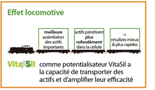 De plus, l’Organic Silicium bio-activated® fonctionne à la manière d’une locomotive et a la capacité de transporter certains actifs et d’amplifier ainsi leur efficacité. Grâce à cette propriété, VitaSil a développé une large gamme de produits, associant l’Organic Silicium bio-activated® à des actifs spécifiques.